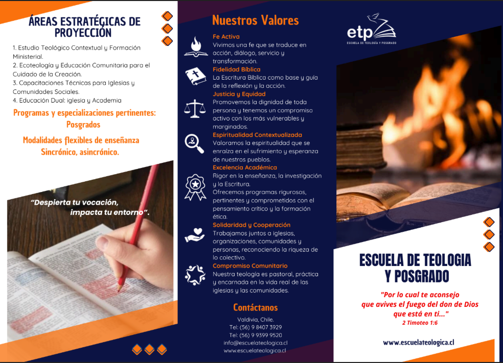 Reciban un fraternal saludo en el nombre de nuestro Señor Jesucristo. Desde la Dirección Académica de la Escuela de Teología y Posgrado (ETP), les damos la más cordial bienvenida a este espacio de formación, reflexión y crecimiento en la fe. En la ETP creemos que el estudio teológico no es solo un ejercicio intelectual, sino una experiencia espiritual que transforma la vida y renueva el compromiso con la misión de Dios en el mundo.
